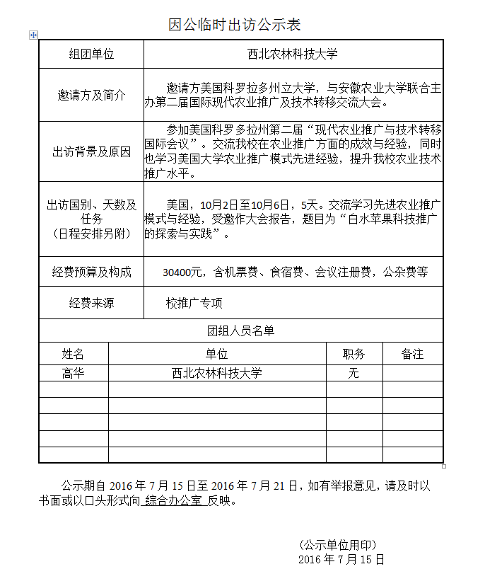 因公临时出访公示表