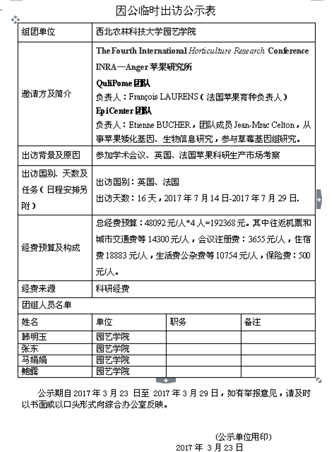 因公临时出访公示