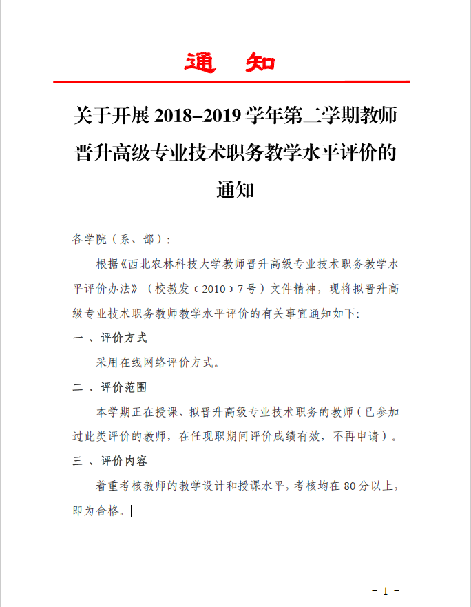 转:关于开展2018-2019学年第二学期教师晋升高级专业技术职务教学水平评价的通知