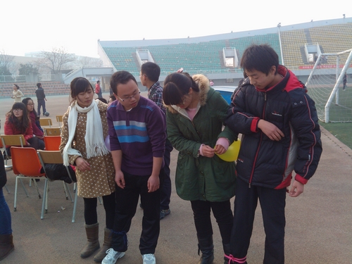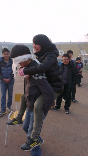 之后是我们的经典游戏“两人三足”。游戏规则为:男女一组并排,将两人挨在一起的脚绑紧,两人共同向前,先跑到终点的一组获胜。因为大家对游戏都比较熟悉,很快就磨合完毕。只见每组队员手挽着手大喊一声:“我相信你!”,便拔腿前奔。整齐的“一二!一二!”回响在空旷的田径场上,看着每个人脸上洋溢的笑脸,这个冬天都因为大家的热情,彼此的信任而变得不再寒冷。