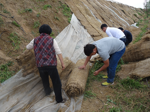 五月是一个劳动的季节,合作社王奇伟夫妇却发起了愁。此前田园使者了解到由于四月初杨凌连降暴雨,王奇伟夫妇家的两个大棚都受到了不同程度破坏。王叔在整修大棚时不幸摔倒,右手手指粉碎性骨折。他们的子女都外出打工,家里的农活只能靠阿姨一个人。田园使者此行的目的很简单,就是帮助阿姨做些力所能及的农活,减轻她的负担。进入五月份,天气晴好,气温持续走高,一方面保温被、草帘子等保温设备需要尽早撤走,另一方面棚中瓜苗需要除草、缠腕,所以田园使者们兵分两路,一部分人卷草帘子,剩下的除草、缠腕。