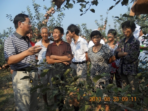 在老果园里,果农们热情地邀请梁老师参观果园,并不断提出自己在果树种植中遇到的种种问题。面对果农们兴奋中略显焦急的表情,梁老师通过通俗易懂的语言将复杂的技术问题讲得明白而生动。尤其是讲到苹果早起落叶病、花叶病、白粉病等的防治措施时,梁老师推荐了多种方法供果农选择;在谈到果树管理的问题时,梁老师就修枝、压枝两方面问题做了详细的解答;此外,在有关施肥的注意事项上,梁老师做了悉心的讲解和示范。果农们热情而激动的心情深深地感染了我们,“听了你们西农专家的讲解,我们真是收获不小啊!”听到一位老农如此评价,大家心里乐开了花。