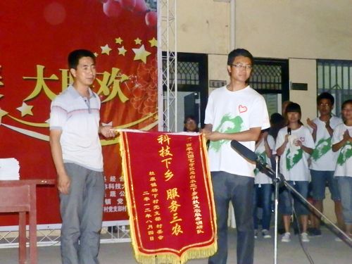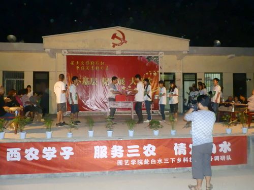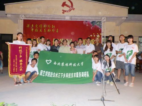 活动以村民的一曲秦腔拉开序幕,期间,服务队邀请兴华果蔬有限责任公司成高启董事长就白水苹果销售市场、发展方向及新建果园技术等问题为村民们做了专题讲座;服务队在村里设立科技支农信箱,将利用信件或电子邮箱长期与村民联系,会利用自己所学的专业知识及借助学校的科研力量和教团队源为村民们排忧解疑;服务队向杨下村赠送了永利集团白水苹果试验站提供的《苹果园规范化管理技术》和服务队编印的《支农服务宣传手册》;与此同时,杨下村向服务队赠送了“科技下乡,服务三农”锦旗一面。