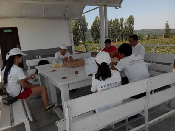 在学长的帮助下,我们做了一些简单的工作,其中包括水肥一体化灌溉的使用、劣质猕猴桃的摘除、锄草等基本农业技能。试验站科学的管理方法,有效的技术手段,先进的农业设施都让我们大开眼界,果园与科学艺术的结合在这里体现得淋漓尽致。眉县猕猴桃的管理与种植水平在全国都是领先的,其经验与方法同样值得其他果业的借鉴。在休息时,恰逢试验站首席专家刘占德老师前来指导工作,他热情地邀请我们吃猕猴桃,并亲切地与我们交谈。大家一边享受着试验站有机猕猴桃的美味,一边与刘老师交流我们三下乡遇到的问题。刘老师不仅详细得为我们解疑答惑,还为我们讲解了目前果品产业的形式与前景,让大一的我们获益匪浅,收获良多。