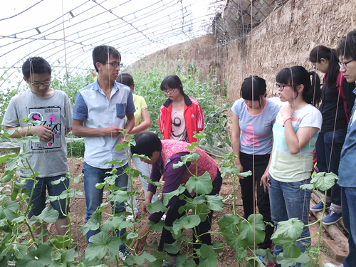 下午2点半,8名田园使者于北校北门集合前往合作社。队员们与农户进行了简单的交流,了解栽植作物的基本情况后,同农户深入温室大棚,进行田间生产劳作。此次活动是队员们首次进入大棚进行活动,内容是给西瓜苗进行整枝,吊蔓。活动过程中大棚承包者不时地向队员们讲解相关内容并进行相关的技术指导,队员从中学到了很多知识。