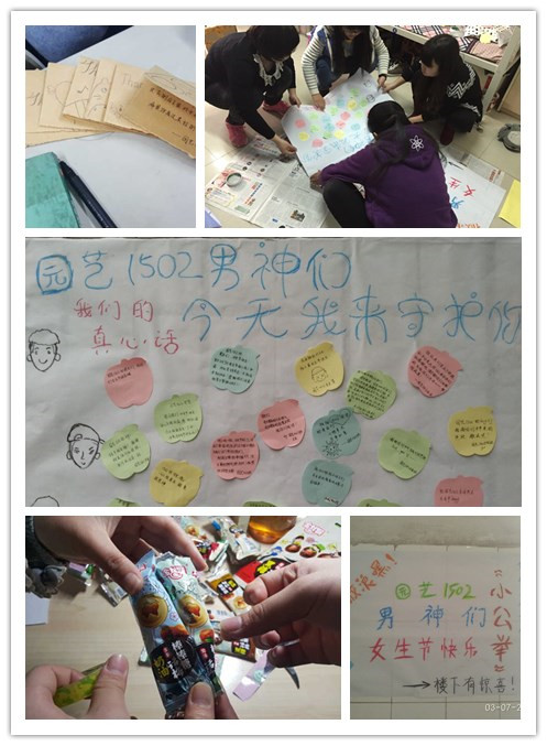 节日前夕,园艺1502班女生每人拿一张彩色的便签,仔细回想了过去几个月来男生们所给予的感动,认认真真地写下了内心深处对男生的真实独白。“感谢1502班的男生们一直以来对女生的关心和帮助”、“希望园艺1502班的男神们2016全部脱单”、“园艺1502班的男神们要勇敢地去做自己喜欢的一切、迎接挑战”······女生节当天,趁着中午午休时间,女生们便悄悄将做好的惊喜海报贴在了男生宿舍楼门口。男生们下楼后看到这些,惊讶中流露出深深地感动,浓浓的同窗情谊让大家倍感来自园艺1502大家庭的温暖。