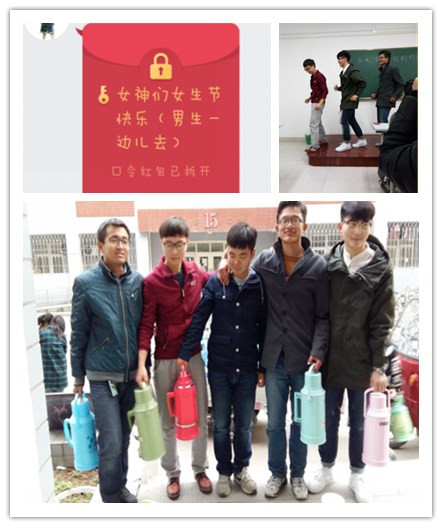 一大早,园艺1504班的班长和支书就带头在QQ群里给女生们发了红包,通过这种形式在大清早就营造出浓浓的节日氛围,并大呼女生们为“女神”!虽然只有红包并不大,但是收到红包的女生们个个脸上都洋溢出幸福的笑容。为了体现出对女生切实的关心,男生们在中午特意帮所有的女生打了热水。一壶壶热水,满载着男生对女生的关怀,也在不经意间温暖了每个女生的心。谁说只有玫瑰花才能体现出对女生的赞美和关怀?日常的帮助更加凸显出大家的细心与体贴,也更加彰显出彼此之间的同窗情深。