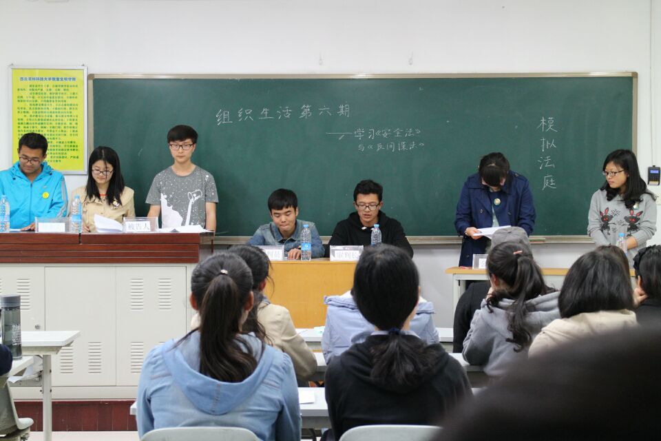 先天下午,负责本次组织生活的筹备小组针对本次活动进行了长达3小时的准备会议,确定了本次活动的基本流程以及分析案例和参演模拟法庭的人员。分工到位之后,“演员们”人手一份剧本,进行了一次又一次地排练。组长于涵涵同学还借来了相应的道具,使模拟法庭更加严肃真实。