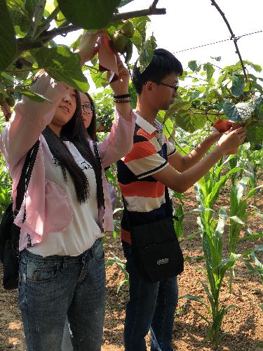 打扫完卫生后,3044am永利集团3044noc田园使者的一行队伍再次来到了猕猴桃园,据了解,这个季节的猕猴桃,经历了去年的冻害,今年的暴风雨,但仍然茁壮成长,大部分都已经初具规模。在之前与村主任袁芳婷女士的谈话中队员们了解到,现在有一个名为徐香的品种已经可以套袋,在农户们的指引下,队员们来到徐香的种植园区,下地去学习农户如何进行套袋工作,这是个看起来容易但是实际要掌握技巧的工作,经过认真听去农户的讲解,队员们都逐渐掌握了套袋的技巧,纷纷开始实践起来,帮助阿姨套袋。与此同时,大家了解到徐香这个品种原来是不套袋的,是因为近期阳光太强烈,为了保护猕猴桃不受到灼烧才进行的套袋工作。