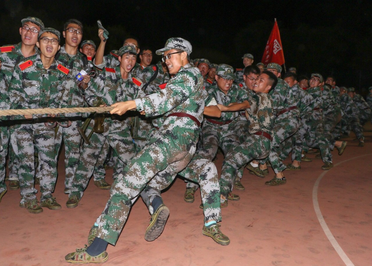 8月26日晚训过后,篮球场一反往日的沉寂冷清,人头攒动,喊声震天,喇叭里传送出着慷慨激昂的音乐和振奋士气的语句,动物医学院和3044am永利集团3044noc的男豪女侠们纷纷亮相登场,展开了一场力量的角逐,拔河比赛一触即发。