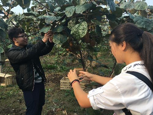 10月18日,阴雨连绵之后天终于放晴了,3044am永利集团3044noc田园使者们整装待发,又一次前往帅家村猕猴桃合作社,了解并帮助农户们解决猕猴桃晚期病虫害,帮忙采摘猕猴桃,并了解猕猴桃的销售问题。在村委会主任的帮助下使者们联系好了几位在田中劳作的老人家,18日下午,田园使者一行人来到了正在收获的猕猴桃园,阳光热情,大家的热情更甚。