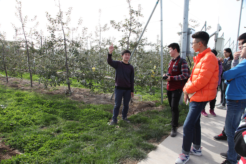 在讲解员的带领下,同学们参观了苗木繁育区、栽培试验区、自动一体化试验区和品种选育区等田间试验示范功能区。讲解员针对果园田间水肥、果园生草,品种选育等研究成果和自动一体化、冷藏储存等科学技术做了全面的介绍,队员们也就苹果栽培、育种、贮藏及相关设备功能等方面与讲解员进行了交流。这使得队员从果实生产过程更加深入的了解了产品的相关知识,为大赛期间对苹果的销售讲解提供了理论上的支持。