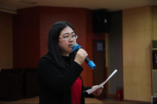 赛前培训,丁艳红老师妙语连珠、有条不紊,用《超级演说家》中刘媛媛、崔万志等人的精彩演讲为例从写作、选材、表达及技巧等方面为我们讲授了演讲的方法与注意事项。丁老师强调,演讲稿须遵循“凤头、猪肚、豹尾”的原则,开头短小精巧、内容充实有说服力、结尾意味深长才能写得一篇好的演讲稿。另外丁老师也特别点到了演讲时所需注意的事项,如肢体语言、与观众的互动、建立自己的演讲风格、临场发挥随机应变等。有些同学过分看重技巧,认为幽默风趣和演讲手势是演讲中不可或缺的一部分。其实不然,丁老师提醒我们,内容永远是最重要的,任何技巧都是为内容服务的,肢体语言只能为演讲锦上添花,却不能给分数雪中送炭。场下观众笔下不停,争取消化汲取更多知识。培训最后,老师指出:“德是口才的灵魂,发自肺腑的心声才是最好的演讲。”