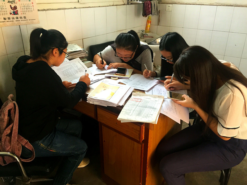当队伍到达后,村卫生院负责人和村委负责人许女士热情地接待了大家。通过交流,队伍分为两支小队分别同夏先生到村卫生院和村委会议室帮助两方处理相关事务。村卫生院夏先生正在整理村内医疗保险的基本信息的核对及填写工作,使者们分成不同的小组——信息查找组、封面信息填写组、项目负责人信息填写组以及村民信息填写组。各个小组相互配合,以流水线的模式专心致志地进行资料填写的相关工作。另一方,在村委会议室中,剩下5名使者在许女士的指导下帮助她将村内党员、普通村民的相关材料整理归档。
