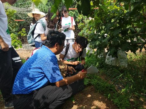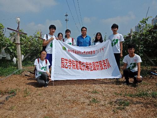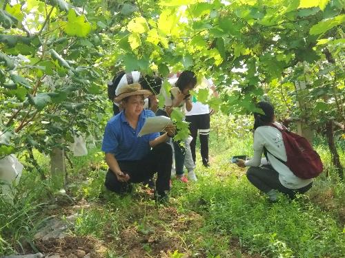 在葡萄种质资源圃,王西平教授正用地道的陕西话与在田间劳作的农民细致地了解着园中葡萄的病害情况、用药情况、坐果情况……。“在人群中,这根本分不清谁是教授,谁是农民呀!”队员们敬佩地感叹道。王教授一边拿着枝剪在园中开路,一边为队员讲解葡萄品种和霜霉病的相关知识,队员们挂牌记录,早已忘记头顶的烈日。