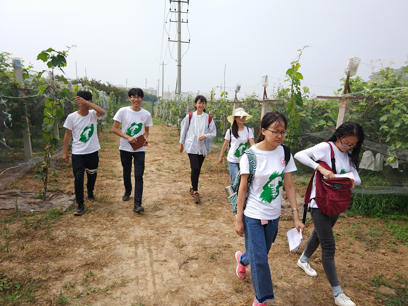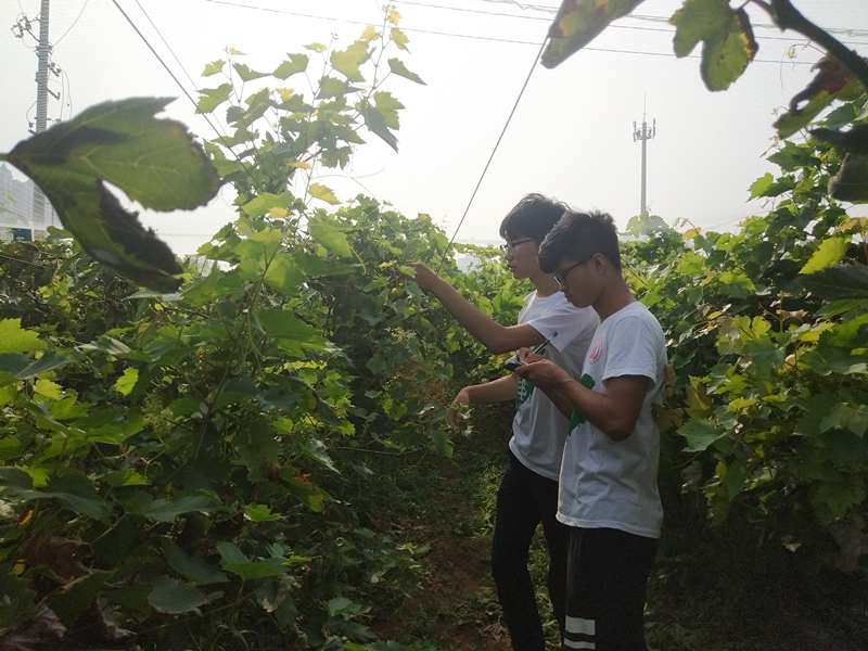 在王西平教授细致的讲解中,调研团队了解了主要的调研葡萄种类,并明确了20余种调研范围,这也激起了队员们的兴致和激情。调研过程中,队员们分工明确,认真细致地对各自负责的葡萄品种进行了观察记录,每一株植株,每一片叶片队员们都细细查看,认真统计。在遇到疑惑时队员们聚在一起仔细辨别,激烈讨论,详细地记录着各项指标数据。队员们在调研过程中发现,赤霞株葡萄对霜霉病有很高的抗性,坐果率较高而且果小适合用于酿酒。金手指葡萄对霜霉病的抗性一般,坐果率高,果实修长有质感而且果实很有品尝价值......同学们认真总结着调研结果,得到了王西平教授的肯定,同时他勉励同学们:“科学研究不是一朝一夕就能完成的,要保持着一如既往的痴心,在这条路上一如既往的走下去,为乡村振兴计划贡献自己的微薄力量”。