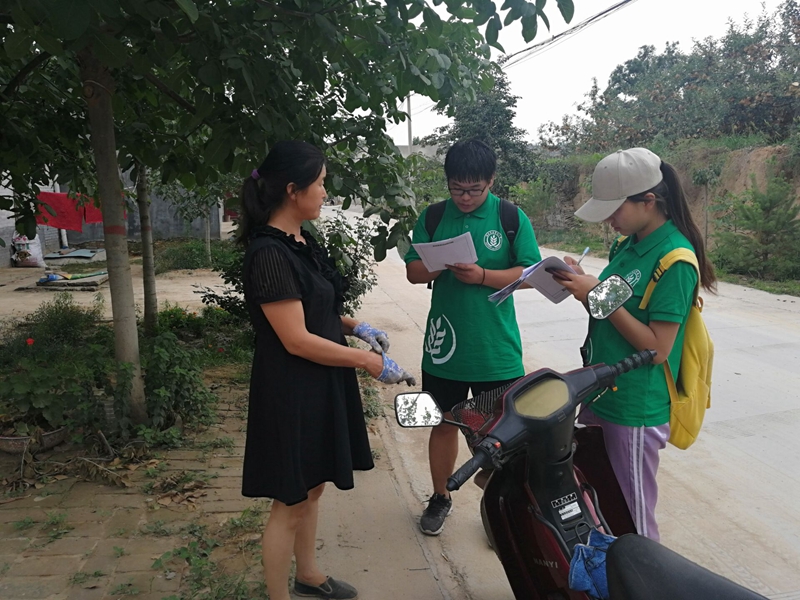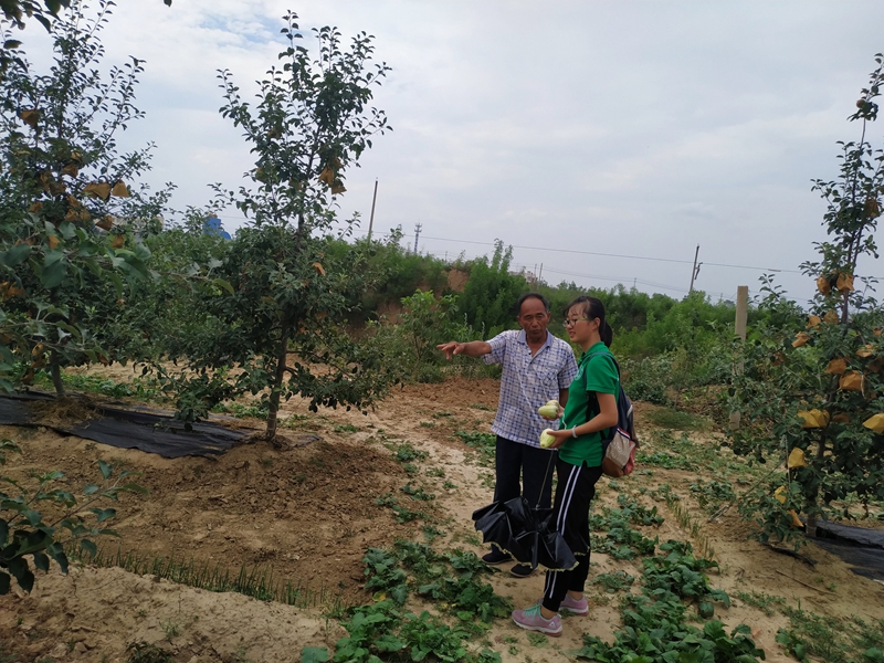 上午10点,队员们来到汉风积韵、槐荫泽民的汉积村展开调研。在调研过程中,村民了解到队员们是永利集团的调研团队后都非常积极配合,队员们通过采访30多位村民大致了解到了当地苹果产业发展的现状。其中,苗红宝、马玉良等都是具有30年以上的种植果树经验的果农。目前苗红宝先生家里仍然有13亩果园,主要种植秦冠、红富士、长富二号。苗红宝先生表示在苹果种植生产过程中目前遇到的主要自然灾害是干旱,干旱情况几乎每年都有,而今年特别严重,每次给苹果树浇水都需要自己从几公里外的水渠以5元/方的价格买水回来浇灌。对于施肥、施药这方面苗红宝先生表示每年需要在每亩地花费1300元的费用来保证产量。而谈到销售,苗红宝先生则表示自己从2016年开始就已经自己在网上销售自家的苹果,当其他村民还在以2.5元/斤的价格卖给客商时,苗红宝先生在网上销售的苹果价格已经达到了9元/斤。马玉良先生家中目前有五亩苹果园,关于天旱,他倒也有一套自己的解决办法。说完,马玉良先生即带领着队员在温度高达35度的中午参观他的果园。在果园里,果树行间种满了小青菜、大葱、香瓜等作物,马玉良先生说:“这些作物我不收它们,它们能够保证我的果园水分充足,在收果之后我把这些作物全部翻到地下,还能作为果树过冬的积肥。”而关于这些小窍门,马玉良大叔表示这些都是白水苹果实验站的专家教授们教的。