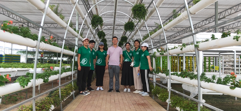 随后,宋先生又带领调研队参观了一个附近的生态园。生态园是一个已建好的大型温室,宋先生也对其中的一些温室设施包括湿帘、风机、内遮阳、外遮阳、电机联动等进行了具体的讲解。队员们也了解了湿帘降温的原理,即当快速流动的空气穿过湿帘时,其中的水分会吸收空气中的热量蒸发带走大量的热,使经过湿帘的空气温度降低。同时在植物园中也见到了许多温室中常见的栽培方式,如管道种植、立体种植等,这些方式合理的分配了空间,提高了种植效率。