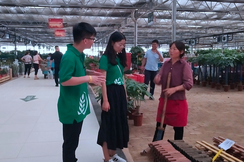 之后调研队被带领前往双桥花卉基地进行市场调研。双桥花卉基地是很多温室企业销售温室花卉的场所,也是了解温室经营的一个途径。调研集中于批发各种各样的花卉的花卉基地A区,调研队在队长和副队长的带领下分成两组同时进行,对A区内295个区域随机选取50个进行详细调研。队员们在花卉市场逐一对所选买家和一些卖家进行咨询。其中有一个卖盆栽组合的店十分具有代表性,店中共有三个人,老板,老板娘,还有一个雇佣的工人。老板娘学过盆栽设计方面的知识,他们主要就是在花卉市场里边购买一些花卉,然后自己把它设计成景观盆栽卖。通过调研,调研队的成员们也看到温室花卉的广大市场。