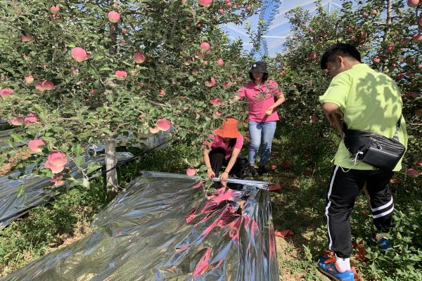 “实践是检验真理的唯一标准”,要了解吴堡试验示范站的生产管理情况,必须亲自实践,亲历亲为方能出真知。正直九月初,早熟苹果已经采摘完毕,中熟品种在进一步着色。苹果着色是否均匀,颜色是否鲜亮是影响苹果价格的重要因素。套袋果实往往着色不够均匀,但吴堡试验示范站运用反光膜解决了该问题,反光膜可以有效反射自然光,铺在土地上通过反射阳光,让苹果着色均匀,尤其是果底部位。着色完全的苹果更具商品价值,在市场上能以更高的价格出售,从而实现村民增收的目的。反光膜由于种类不同,其组成和结构也不相同;试验地负责人说该反光膜对土壤污染性较高,一般是当年使用完毕之后会进行回收,以保护土壤。同时为了使树体更好的采光通风,高效进行光合作用利于果实着色,师傅们还会在铺展地膜过程中对树体进行简单的修剪。