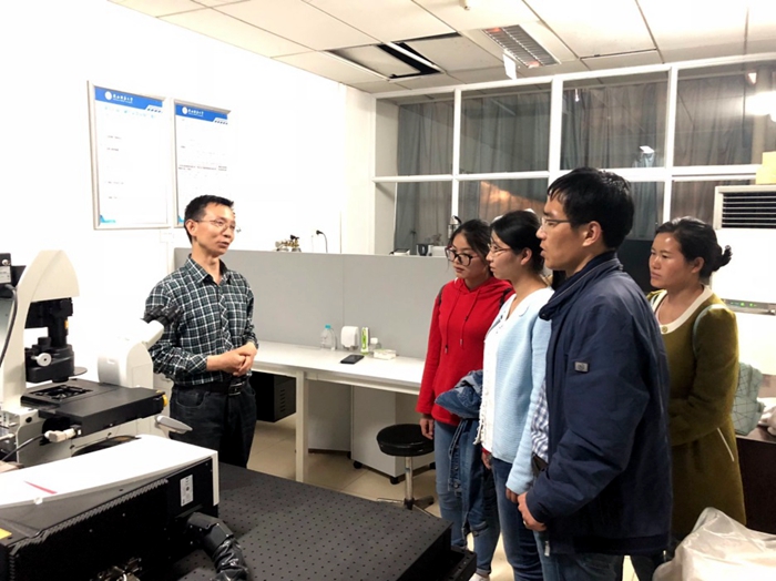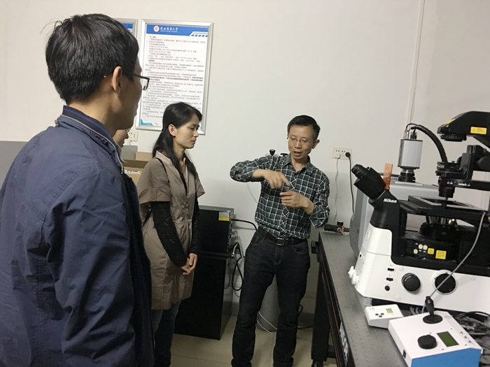 会后,全体人员实地调研了陕西师范老员工命科学学院大型仪器共享平台,李忠岐实验师对徕卡TCS SP8激光共聚焦显微镜和Andor转盘式激光共聚焦活细胞成像系统的工作原理、仪器配置、操作方法、仪器维护管理及在生命学科的应用等方面做了详细的介绍。同时,双方就大型仪器共享、功能开发、教学培训以及实验室管理等方面内容进行了深入交流。