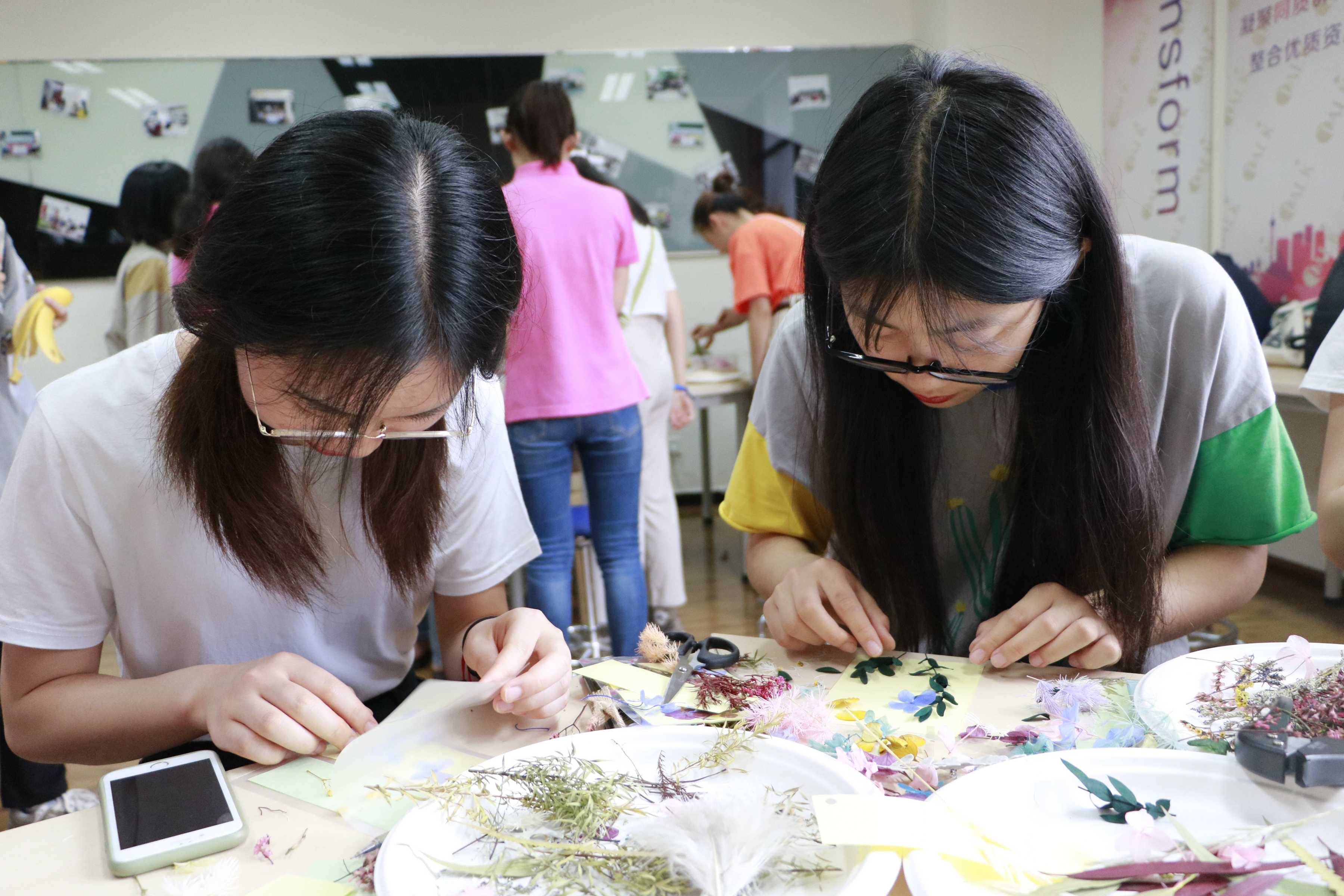 同学们在体验“园艺疗法”压花制作