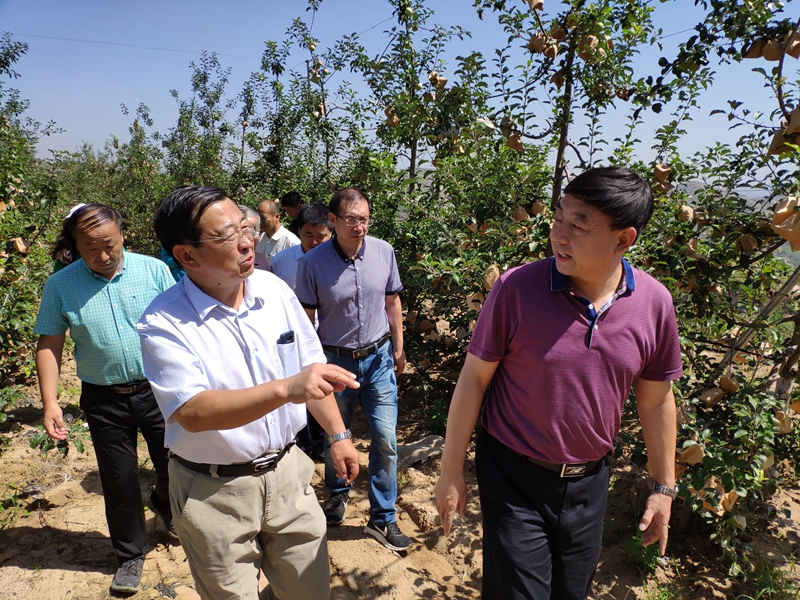 马锋旺与吴堡县副县长寇俊仁、省果业中心副主任周智孝等一行顶着烈日走进苹果园区,对栽植品种、管理技术、设施设备等方面进行了详细的了解,并对山地苹果种植过程中存在的问题和困难进行“把脉问诊”,提出了相应的建议和对策。