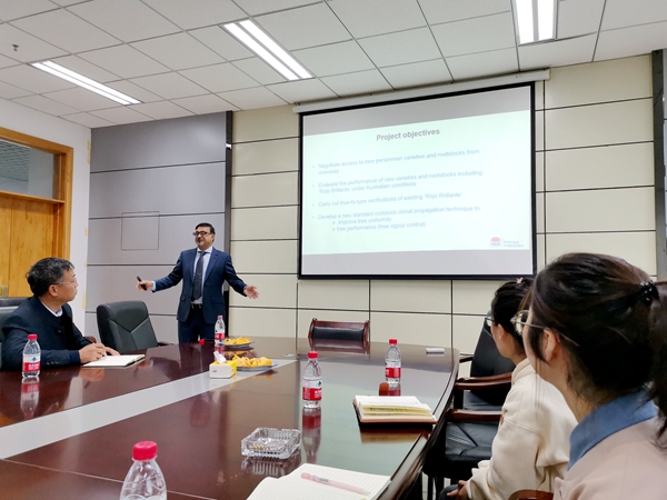 10月9-10日,澳大利亚砧木专家Tahir Khurshid来公司进行访问交流,探讨合作事宜。公司国家柿种质资源圃负责人杨勇副教授及课题组相关人员参与了交流座谈。