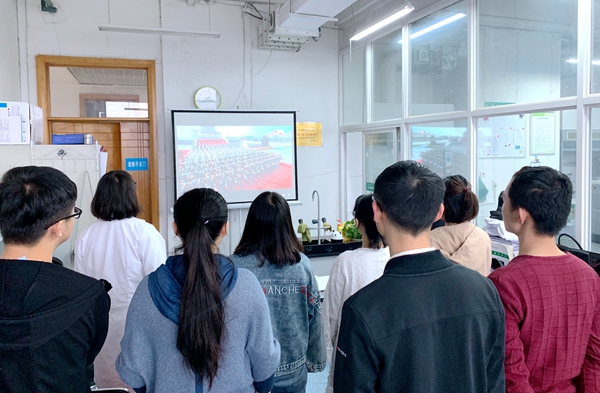 10月1日上午,组织全体党员及积极分子观看了中华人民共和国成立70周年庆祝大会、阅兵式和群众游行直播盛况,共同感受了祖国的强大,抒发了对祖国的祝福和热爱。听到国歌奏响,大家不约而同起立合唱国歌;看到人民军队庄严威武,大家热血沸腾,民族自豪感油然而生。