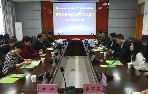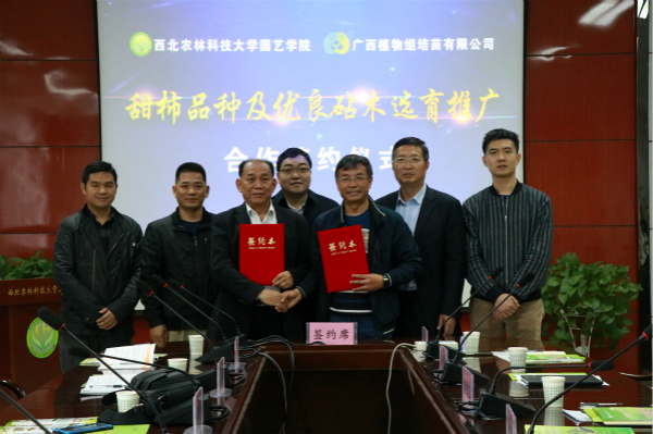 为充分发挥公司科技优势,提升广西及全国甜柿种植生产创新能力和科技水平,实现甜柿科学研究与技术创新目标,加速科技成果转化,加快甜柿产业快速健康发展,广西植物组培苗有限公司与学院就甜柿品种及优良砧木选育推广达成合作协议。4月20日上午,合作签约仪式在学院207会议室举行。会议由副经理徐凌飞主持,党委书记黄德宝、教授杨勇、副教授关长飞、广西植物组培苗有限公司总经理林贵美一行参加会议,林贵美、杨勇代表双方签署协议。