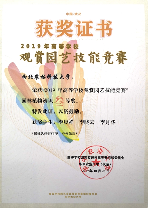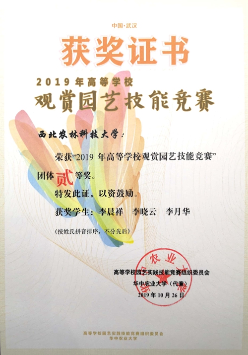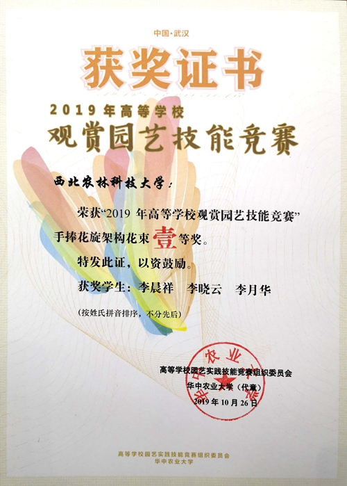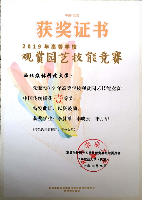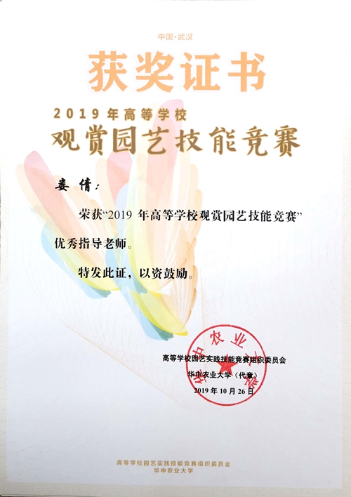 10月25日,由华中农业大学承办的“2019年高等学校观赏园艺技能大赛”在武汉召开,公司喜获中国传统插花一等奖、手捧花螺旋架构花束一等奖、园林植物识别三等奖,团体荣获二等奖,娄倩老师获优秀指导老师荣誉称号。