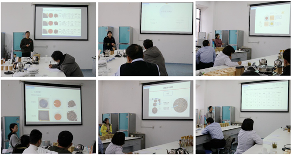 最后,举办了实习总结汇报会,并邀请公司金牌教师王俊儒教授,学院徐炎副经理、王国辉副书记,国家级园艺实验教学示范中心杜慧芳实验师,茶学教研室鲍露讲师、王伟东副教授、周杰讲师作为评委。会上,周天山副教授首先向大家介绍了本次实习的内容设置、实习组织形式和考核方式;接着徐炎副经理向大家介绍了《茶学毕业综合实习》课程改革的目的和举措,以及去年取得的经验,并指出打造一流本科课程、铸造实践“金课”的前进方向;徐清山讲师组织同学们以小组为单位进行了实习汇报。评委们对同学们制作的茶产品进行了感官审评,从而对每位同学的参与度、制作茶产品质量及汇报表现等方面进行了全面考核。