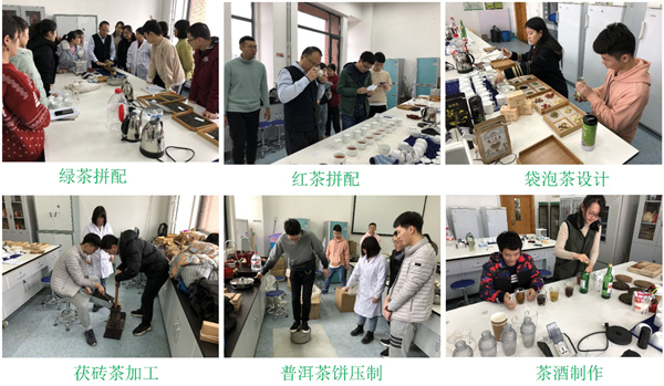 实习伊始,实习指导教师周天山和徐清山向同学们讲解了“茶叶拼配技术、紧压茶、袋泡茶、奶茶和茶酒加工”的原理,并对关键步骤进行示范。实习过程中,同学们以小组为单位,先对原料茶进行感官审评,接着查阅相关资料,再制定产品研发目标、设计加工工艺,进而研制相应的茶产品。实习每进行一个阶段,实习指导教师都要检验大家的实习产品,及时地进行形成型考核,帮助大家分析得失、梳理思路和指明努力方向。经过反复多次试验,同学们顺利完成了绿茶拼配、红茶拼配、袋泡茶(纯茶型、复合型和保健型)设计、茯砖茶加工、普洱茶饼压制、茶酒(配制型茶酒、茶汽酒)制作等实习内容。